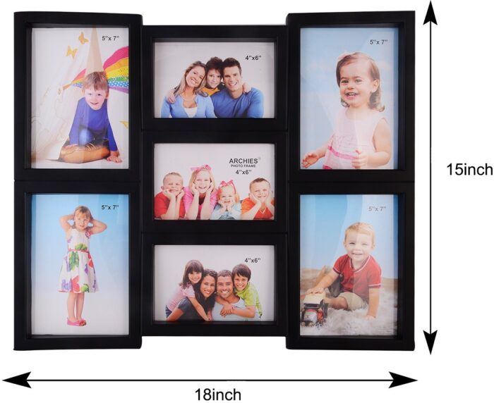 product specification keyStand Material, valuePlastic, keyFrame Material, valueAcrylic, keyBacking, valuePlastic, keyFinishing, valueGlossy, keyMaterial, valueGlass, keyNumber of Contents in Sales Package, valuePack of 1, keySales Package, value1 Photo Frame, keyShape, valueSquare, keycolor, valueBlack, keyNumber of Photos, value7, keyMounted, valueWall mounted, Table mounted Mounted, keyIdeal For, valueFamily, keyWeight, value500 g, keySuitable Photo Size, value15 x 10 cm, 12.70 x 17.78 cm, keyHeight, value15 inch, keyWidth, value18 inch, keyDepth, value2.54 cm, keyCare and Cleaning, valueWipe With a Wet Cotton Cloth