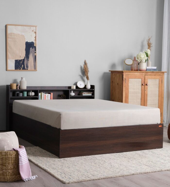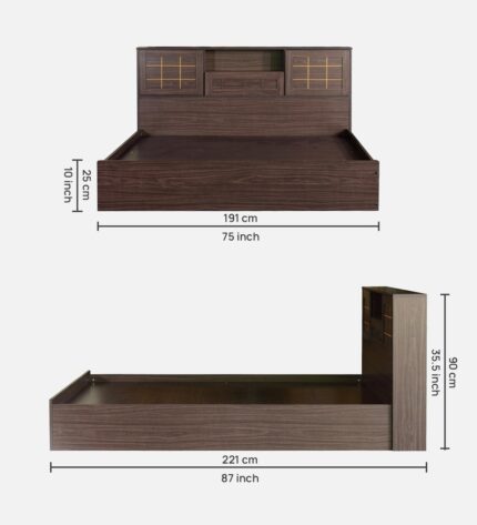 Specification GeneralProduct Dimensions: Length 76 Inches (193 Cms), Depth 86 Inches (218 Cms), Height 32 Inches (80 Cms), Seating Height 14 Inches (36 Cms), Product Attributes: Frame Material: High Grade Engineered Wood With Natural Wood Grain FinishColor: Chestnut DarkWeight: 112 KgsStorage Type: Box Storage (Total Storage: 900 Litres)Headboard Style: With Storage, Recommended Mattress Size: 78X72 Inches, Assembly: Required, Provided By Brand, Additional Benefits: Long Lasting/Durable, Termite Resistant, Fine Texture & Ergonomically Designed For Good Sleep.