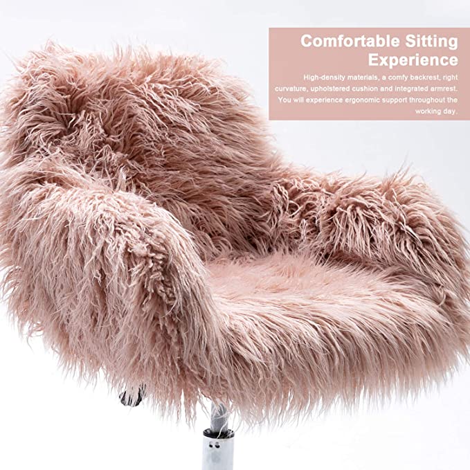 Colour: Pi olour Pi ra DKLGG tyle Moder pecial Feature Swivel, Adjustable_Height aterial Faux Fur, Metal ecomme ed Uses For Product Office oom Type Office, Bedroom, Livi Room rame Material Metal ge Ra e (Descriptio Adult et Qua ity 1.0 cou ee less bout this item ersatile & Fashio ble Faux Fur Desk Chair: Stylish a fuzzy to the touch, this versatile a fashio ble pi fur desk chair takes the bori out of typical home or professio l office seati . Crafted o metal frame, this faux fur desk chair features shaggy faux fur upholstery to put some fu i o your work, a a sleek, silver fi sh that compleme s a color scheme i your space. Make every day a little more fu uper Sturdy & Durable Faux Fur Desk Chair: This chair for bedroom desk is t all about good looks either. The girl room desk chair is crafted from a high quality faux fur fabric, metal frame a sturdy legs which is very solid a durable that ca withsta the weight up to 250 lbs a wear very well to offer lo lasti durability for ma years. omfy Seati Experie e Faux Fur Desk Chair: The pi faux fur upholstery provides you with a comfy seati experie e. Made by skilled craftsme the seat itself is li d with fi faux fur for a soft, glam feel, while high de ity foam fill provides extra paddi . Soft to touch shaggy faux fur upholstery make this makeup chair more moder a stylish. The plush va ty chair ca be put o the livi room/bedroom as home office chair/ makeup stool/childre remote lear chair. otate 360 Degrees & Easy Movi 5 Wheels Faux Fur Desk Chair: Five double wheel casters gives you easy mobility, while a 360 degree swivel tech que keeps you movi while you work. The fuzzy side chair‘s adjustable height lets you sit comfortably, which mi mizes ck strai stiff shoulders, a backaches. The faux fur pi desk chair has a spacious seat a adjustable height betwee 16.53” 20.27” with the chair’s o touch height adjustme lever to suit your eds. asy Assembly & Mai e e Faux Fur Desk Chair: Everythi you ed is efficie ly packed i o your package ll parts, tools a i tructio are i luded for easy, o perso assembly i u er 10 mi s. Brush it to fluff up the faux fur whe taki out the faux fur chair. Mai e e is also very easy, just wipe the pi furry chair with a slightly moiste d cloth, a the choose a site that’s well ve ilated for air dryi without direct heat or su