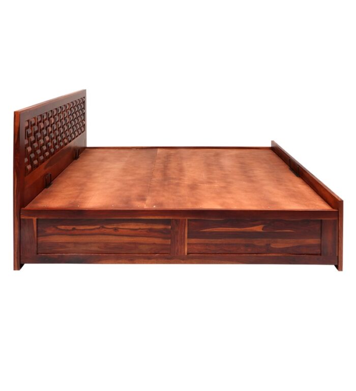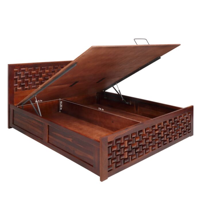 Specification GeneralMade Up Of Kiln Dried Chemically Treated Sheesham Solid Wood.Bed Head Board Is 40 mm Thick.Side Panels Are 27mm Thick .The headboard Has Very Elegant Design.Foot Board Is 27 mm Thck.Height Of The Side Rails From The Floor Is 400mm.Mattress Pannel Made Up With Ply Wood Which Is Very Sturdy & Durable.This Bed Has Box Storage.Recommended Mattress Size : 78X 72.Disclaimers:Accessories shown in the image are only for representation and are not part of the product.Depending on your screen settings and resolution on your device there may be a slight variance in fabric color and wood polish of the image and actual product.Wood grains will vary from product to product in case of solid wood furniture.Furniture having intricate hand-painted details are individual unique pieces and may have slight distinctions and variance between the picture and actual product.The Primary material is the main material used to manufacture the product and in addition to the primary material there might also be other type of materials used in the manufacturing of the product