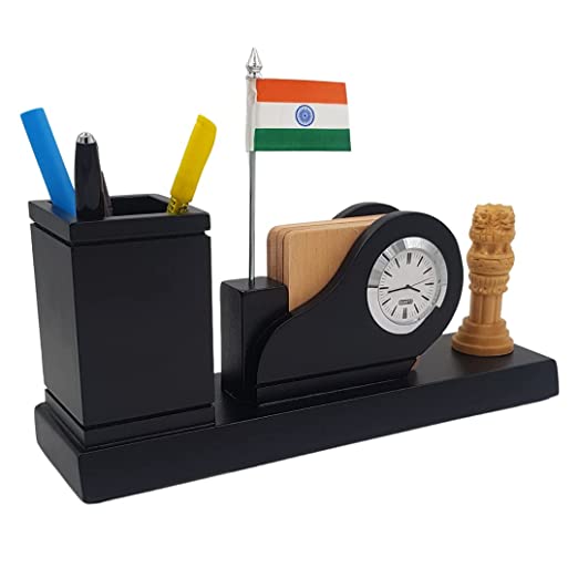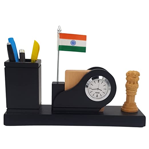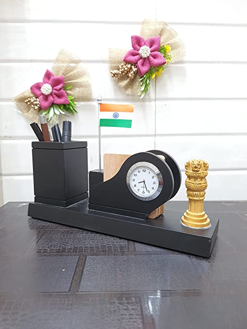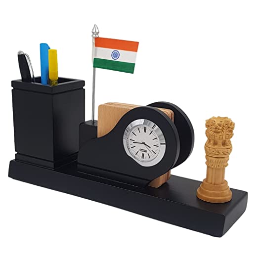 Home Clocks Woodhouse Wooden Pen Stand with Clock for Office Table & Study Table, Wooden Pen Stand with Indian Flag, Ashok Pillar/Ashok Stambh for Office Table Stylish, Beautiful Pen Stand, Wooden Pencil Stand